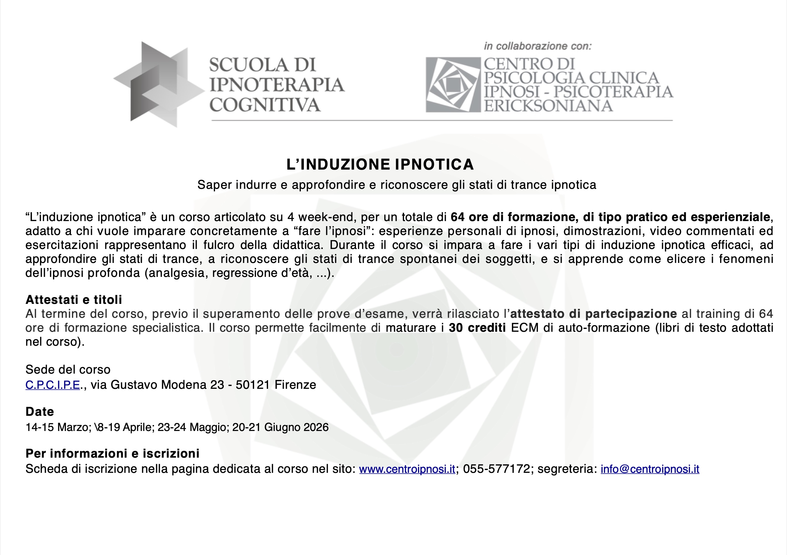 FIRENZE – Corso di base, pratico ed esperienziale, adatto a chi vuole apprendere concretamente a “fare” l’ipnosi.